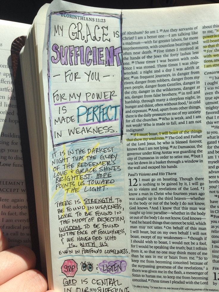 âEach time he said, âMy grace is all you need. My power works best in weakness.â So now I am glad to boast about my weaknesses, so that the power of Christ can work through me. (2nd Corinthians 12:9 NLT)